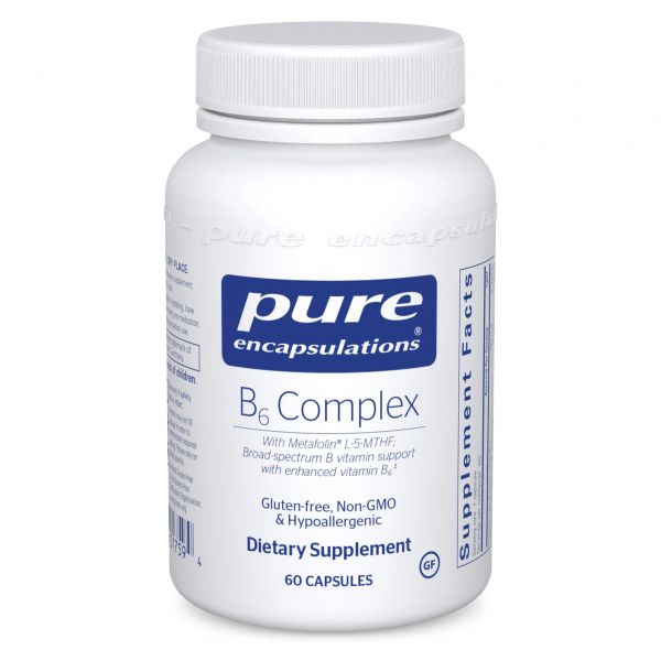 Broad-spectrum B vitamin support with enhanced vitamin B6*. B6 Complex offers the wide-ranging support of B-Complex Plus with additional vitamin B6. Vitamin B6 is important in amino acid metabolism, hemoglobin formation, nerve impulse transmissions, and hormone synthesis.* Comprehensive B vitamin supplement with enhanced levels of vitamin B6 to support proper functioning of the nervous system and healthy cognitive function.* Includes researched and activated forms, including pyridoxal-5-phosphate, riboflavin-5-phosphate, and folate as 5-methyltetrahydrofolate (5-MTHF), the universally metabolized and biologically active form of folate* Enhanced with vitamin B6 to promote healthy neurological function* Offers vitamin B12 in a unique blend of adenosylcobalamin and hydroxycobalamin Includes choline and inositol to support healthy methylation and cognitive function* Made with hypoallergenic, vegan ingredients