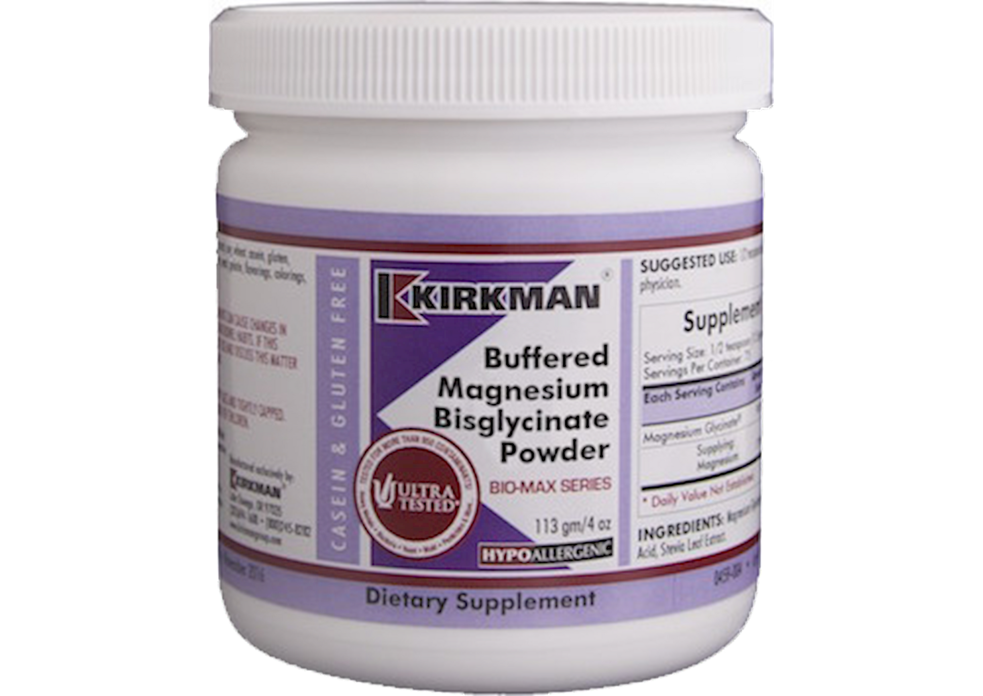Relaxes nerves and muscles and promotes relaxation and restful sleep.* This new and improved product offers Magnesium Bisglycinate that is sweetened with stevia leaf extract. The powder can be dissolved in fruit juices so that very little bad taste is still evident. It can even be dissolved in water with only a slight aftertaste. Magnesium Bisglycinate is easy on the digestive system. This product is also part of our Bio-Max Series that uses forms of nutrients that have been clinically proven to be among the best absorbed and most highly bioavailable. Free of common allergens. Gluten and casein free. Ultra Tested. Magnesium is an essential mineral that is involved in many body functions as well as being a constituent of bones and teeth.* It is an essential element of cellular metabolism and is an enzyme activator.* Other body actions include: relaxing nerve impulses and muscle contractions*; promoting relaxation and contributing to restful sleep.* Signs and symptoms of magnesium deficiency can include fatigue, mental confusion, irritability, weakness, muscle spasms, loss of appetite, difficulty sleeping or a feeling of weakness. The Physicians Desk Reference for Nutritional Supplements states that recent data of inpatient and outpatient populations suggests that magnesium deficits may exist in 12% to 40% of individuals. There are many different forms of magnesium, and no compelling data about absorption differences. However, there are reported differences in how different forms affect the gastrointestinal tract. Forms and functions of some of these include: Oxide: tends to firm stools in some individuals and loosen stools in others* Glycinate: a very gentle form of magnesium that is easier on the system* Citrate: tends to loosen stools* Sulfate: tends to loosen stools* Chloride: tends to loosen stools.* Individual results may vary. Your physician should recommend the form thats right for you. Magnesium supplements usually have their beginning as minerals that have been influenced by our environment. For that reason, the purity of magnesium raw materials is important. Magnesium, like calcium, can have undesirable impurities present. Kirkmans magnesium is Ultra Tested, which means it is tested for more than 950 environmental contaminants, the highest standard of purity testing in the world.