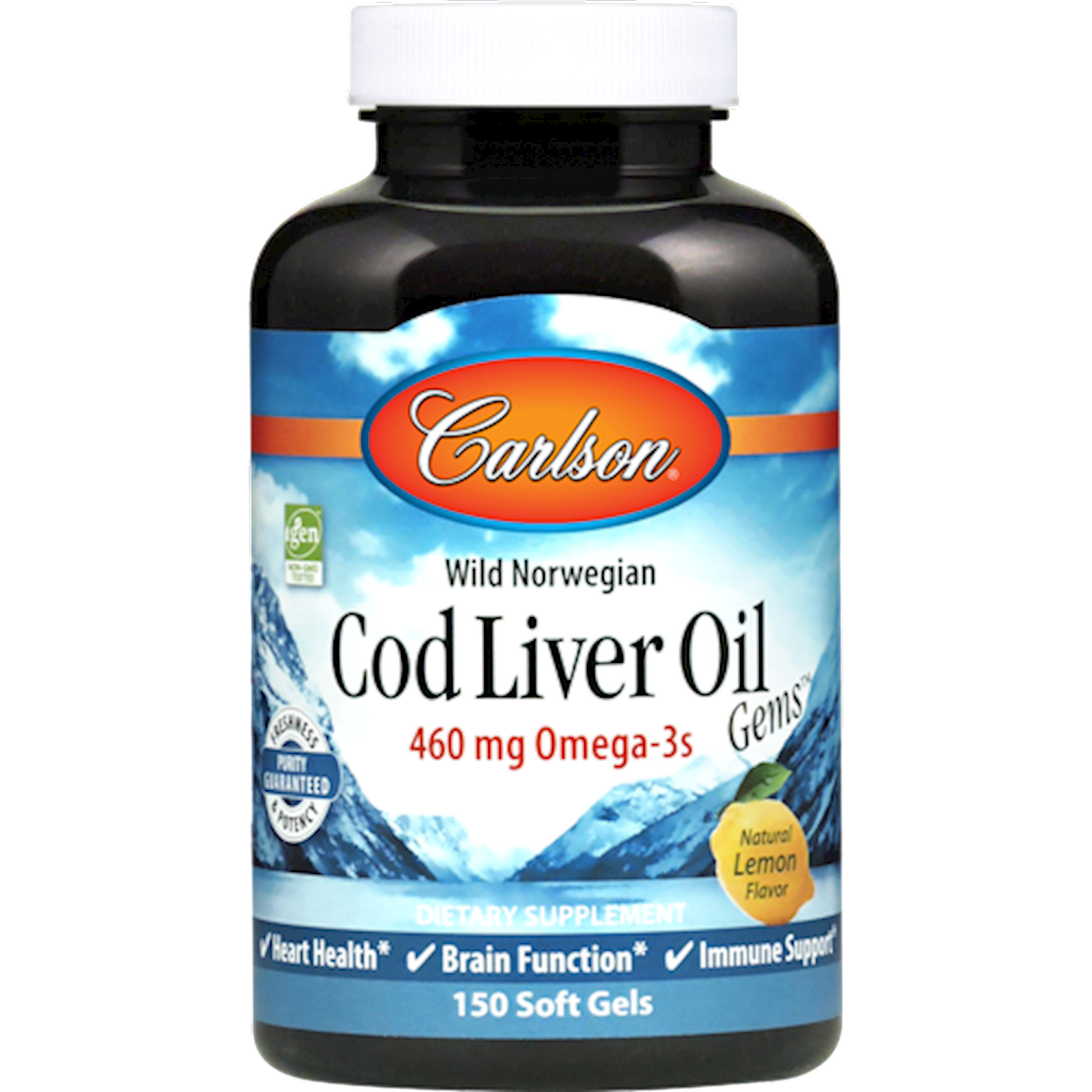 Each serving of Cod Liver Oil Gems provides 460 mg of omega-3s, which support heart, brain, vision, and joint health.* Cod Liver Oil Gems have a delicious lightly lemon flavor, so soft gels can be chewed or swallowed. To ensure maximum freshness, Cod Liver Oil Gems are closely managed from sea to store. Carlson Labs sources the highest quality Arctic cod off the coast of Norway using traditional, sustainable methods. The same day they're caught, the fish are transported to a highly regulated Norwegian facility for processing and purification. Like all Carlson omega-3s, freshness, potency, and purity are guaranteed. Supports heart, brain, and immune function* 460 mg of omega-3s per serving Light lemon-flavored soft gels Sustainably sourced from wild-caught Norwegian Arctic cod IFOS and IGEN non-GMO certified Freshness, potency, and purity guaranteed