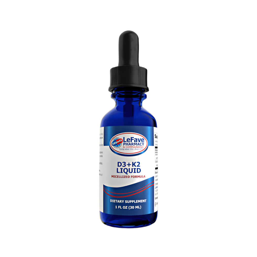 D3 + K2 Liquid is a soy-free, natural vitamin D3 and vitamin K2 in a water-soluble micellized form. Micellization greatly increases the solubility, absorption and bioavailability over oil or emulsified forms.*
