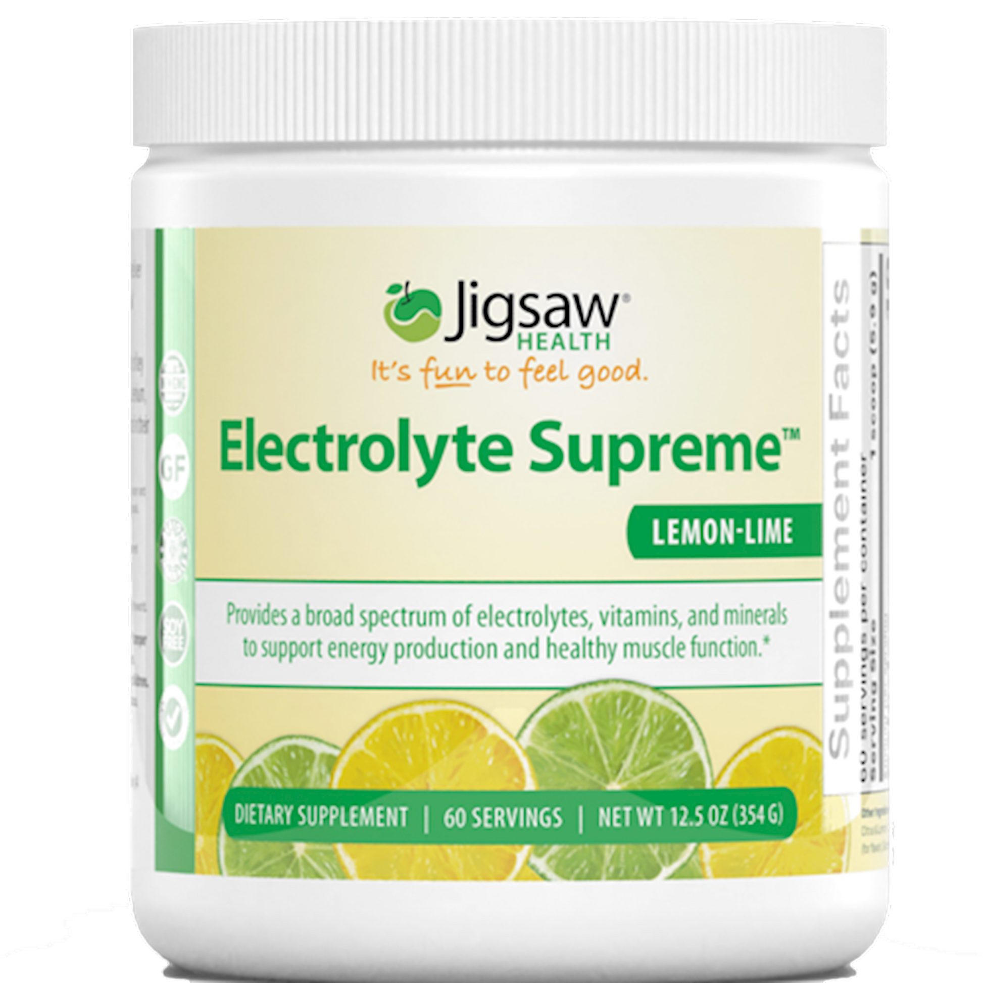 What is Jigsaw Electrolyte Supreme Jigsaw Electrolyte Supreme contains a broad spectrum of electrolytes, minerals and vitamins in each serving. Replenish and rehydrate your body by adding one scoop of Jigsaw Electrolyte Supreme to your water for a refreshing and nourishing energy-boosting beverage.* What can Jigsaw Electrolyte Supreme help me with* Replenish minerals, B-Vitamins, and electrolytes lost daily through sweat, urination, occasional diarrhea and exercise* Support healthy relaxed muscle tone and function* Support athletic recovery* Support steady energy production* Enhance hydration* Support proper fluid balance within cells* Support nerve impulses from nervous system to other body parts* What makes Jigsaw Electrolyte Supreme unique Provides a broad profile of important minerals and electrolytes* Uses only the best ingredients in their active, bioavailable forms* Good source of active B Complex Vitamins to support energy production* Includes dimagnesium malate for superior absorption* Contains no sugar, so you can enjoy it guilt free* Because plain water is just that...plain! Plain drinking water, even bottled ""mineral water"", does not deliver the necessary quantity or balance of the essential electrolytes that your body requires for optimal hydration.* Jigsaw Electrolyte Supreme provides a balanced combination of key electrolytes and minerals such as calcium, magnesium, zinc, selenium, sodium and potassium as well as important B Complex Vitamins in their active, bioavailable form to enhance energy production.* Should I continue to take my Magnesium w/SRT in addition to Jigsaw Electrolyte Supreme Yes. Although Jigsaw Electrolyte Supreme contains 20mg of magnesium, it is not nearly enough to meet your daily requirements (too much magnesium in a powder form can cause diarrhea and stomach upset). Jigsaw Electrolyte Supreme was carefully formulated to provide balanced electrolytes to enhance hydration and add back the nutrients that plain water lacks that your body requires throughout the day.*