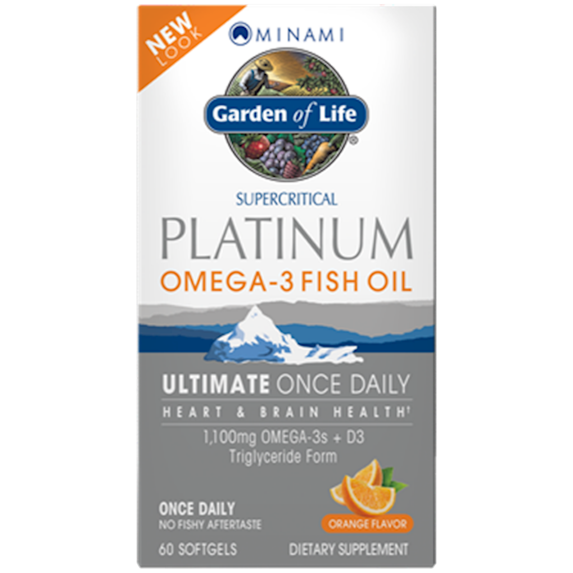 Minami Platinum Omega-3 Fish Oil is an ultra-concentrated omega-3 supplement made from the purest fish oil utilizing dual supercritical CO2 extraction technology that delivers an unprecedented 1,100mg of omega-3s in the natural triglyceride form, in just one softgel daily. Unlike fish oils, which are two-thirds saturated fat, Platinum Omega-3 Fish Oil contains no saturated fat. It has a clean orange flavor with no fishy aftertaste, and with 1,000IU of added vitamin D, this unique omega-3 supplement is designed to support brain, mood, immune and cardiovascular health. Platinum Omega-3 Fish Oil is an ultra-premium, concentrated omega-3 supplement utilizing dual supercritical CO2 extraction technology that delivers an unprecedented 1,100mg of omega-3 nutrition and 250% Daily Value of vitamin D. Minami oils utilize liquid CO2 extraction and are exposed to less heat than other leading brands with no saturated fat as filler. Minami is one of the highest-concentrated omega-3s available, which is super convenient because you get more omega-3 nutrition per softgel, which means fewer pills to swallow. With unsurpassed purity, Minami oils go through rigorous in-house and third-party testing and have remarkably low levels of oxidation as well as undetectable levels of dioxins, pesticides and heavy metals such as mercury. Minami is committed to the advancement of scientific support for omega-3 nutrition and has participated in 11 human clinical studies. Minami uses the latest omega-3 research to formulate specific ratios of EPA and DHA to support the body and its systems, obtains fish from sustainably managed waters and is the only fish oil in the world to receive EMAS (Eco-Management and Audit Scheme) statusa highly stringent European standard. Minami Platinum Omega-3 Fish Oil Benefits: Supports cardiovascular health Supports cognitive function Supports a healthy immune system Supports a healthy mood Platinum Omega-3 Fish Oilan ultra-premium omega-3 supplement utilizing dual supercritical CO2 extraction technology that delivers an unprecedented 1,100mg of omega-3 nutrition and 250% Daily Value of vitamin D in just one softgel.